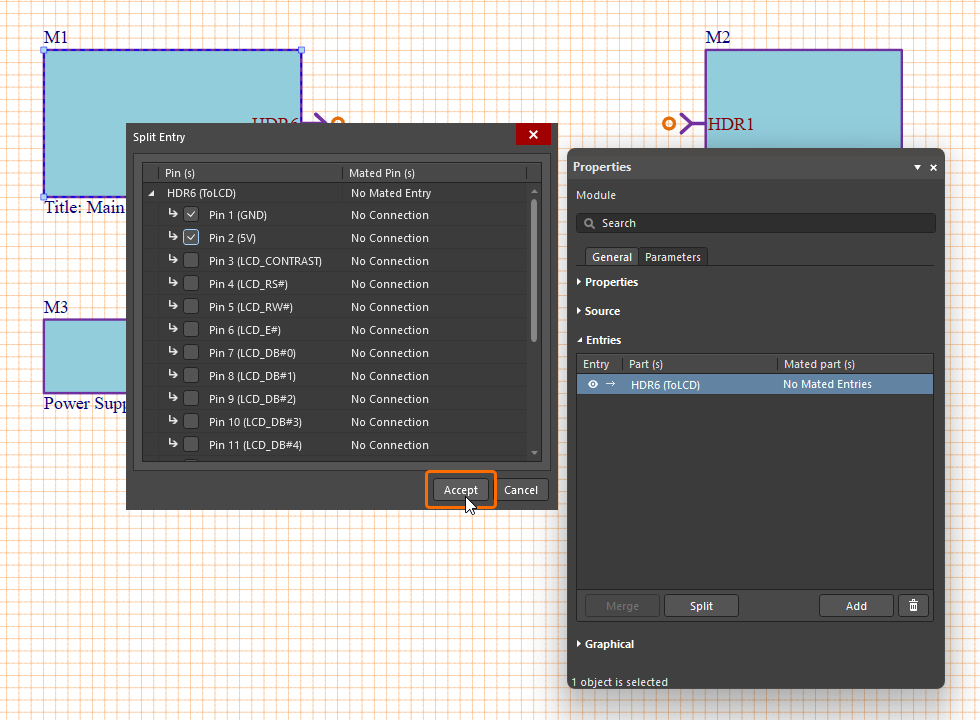 In the example shown, entry HDR6 on module M1 is intended to connect to both module M2 (a panel LCD display) and module M3 (a power supply board). The HDR6 entry connections have been split to logically separate out three power nets that will connect to HDR3 on power supply module M3. This creates an additional HDR6 entry on M1 (HDR6 [1-2,15]) that offers just the three power connections for M3, while the original HDR6 entry is automatically reassigned to offer the remaining 17 connections, which ultimately connect to HDR1 on the LCD module M2.