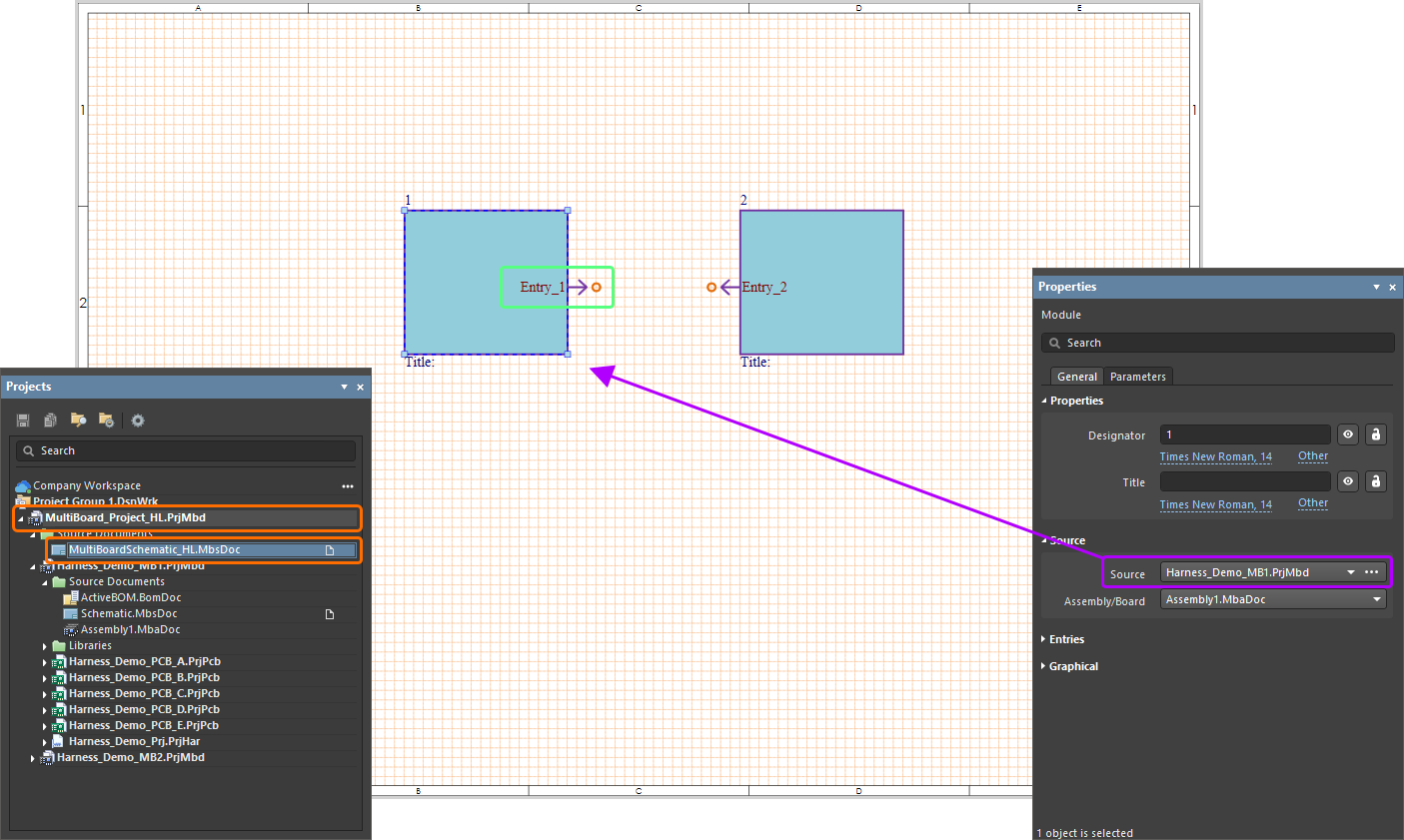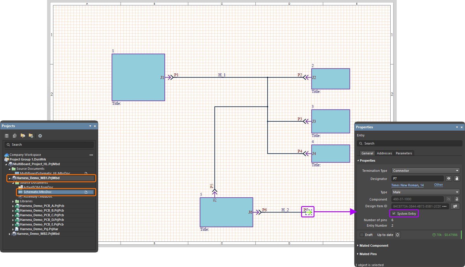 • If one end of the harness connection remains unconnected (terminated in the free space), you can enable the System Entry option in the Properties panel when the entry on this end of the connection is selected to denote the entry as a system-level connection. This can be used to make connections between multiple multi-board projects that are in a nested configuration.