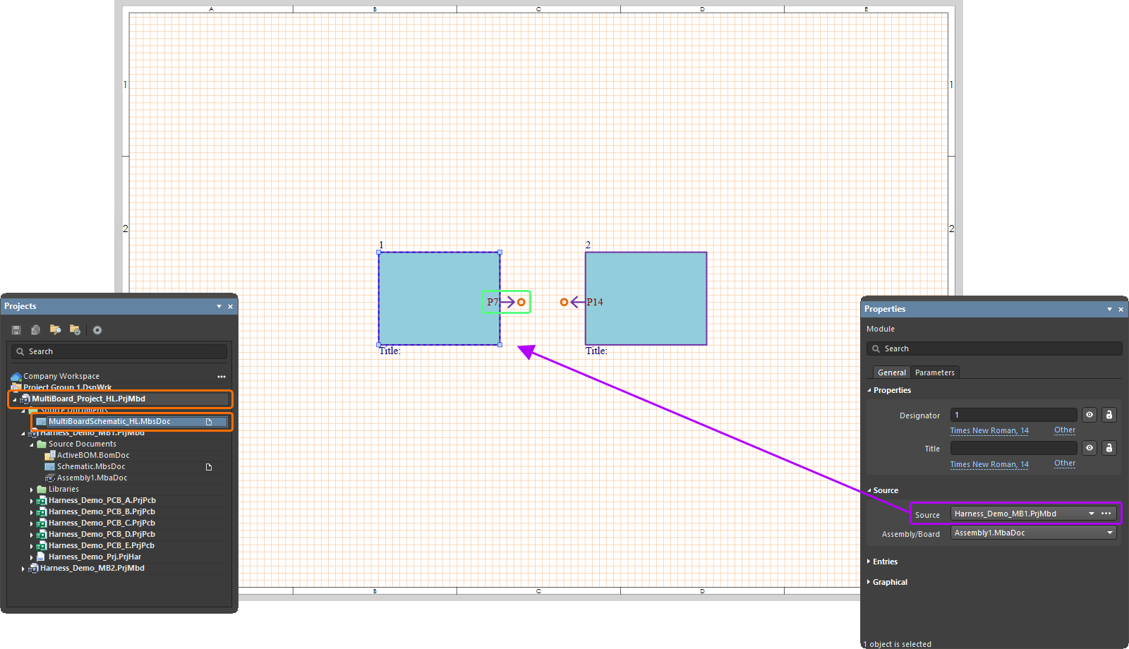 When changes are imported to the parent Multi-board project, this harness connector will be added as a module entry of the child project's module.