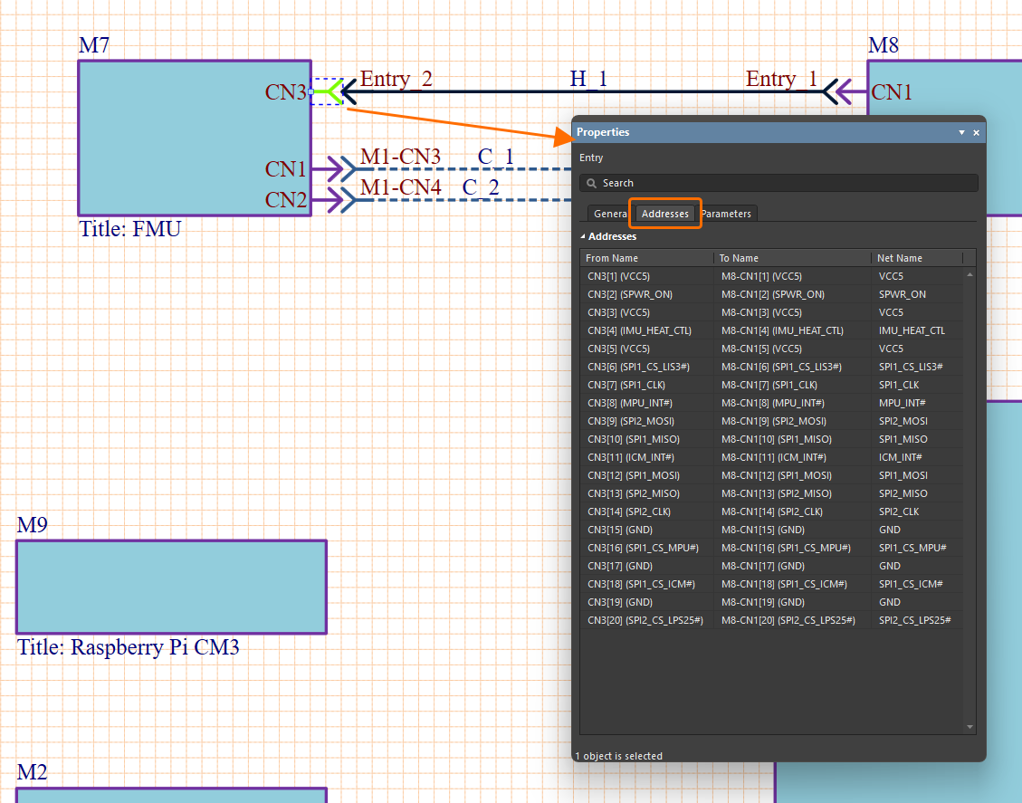 • Once a connection is placed (and, for a cable or harness connection, components are assigned to its terminating entries), the Mated Part column of the table in the Mated Parts/Pins region on the General tab of the Properties panel when a module or terminating entry is selected is populated with data about the mated part and the corresponding list of the connector entries – . Also, the Addresses tab of the panel provides a tabular listing of the connection paths and nets for the selected entry in terms of the part, pin, and net name of the source connection in the entry's module (the From Name column), the part, pin, and net name of the terminating connection in the 'target' module (the To Name column), the net name for the connection as either a single name or as an aggregated net name (target_net/source_net, the Net Name column) –