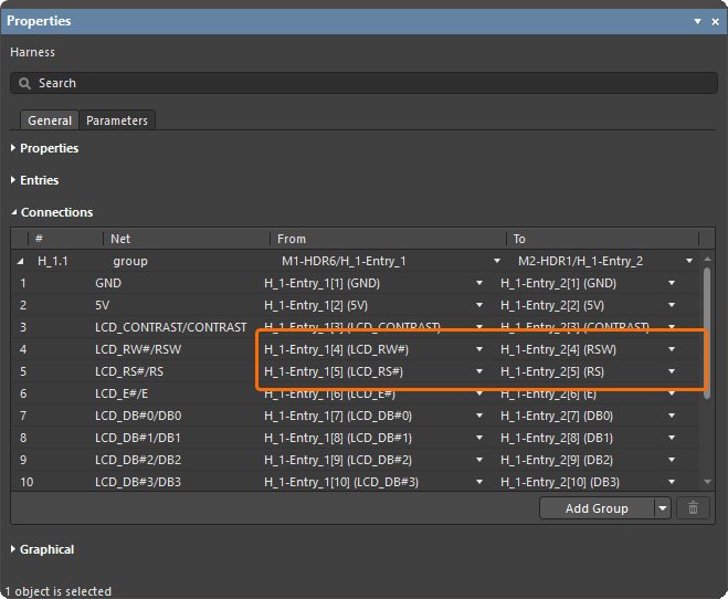 In the Properties panel image shown below, the example conflict for the H_1 connection was resolved using the option. This has effectively crossed over connections 4 and 5 so that the correct net continuity is maintained, i.e., the Reset and Read/Write nets are matched between project modules (LCD_RW# → RSW and LCD_RS# → RS, respectively).