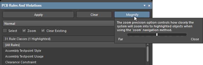 Note that if you have the Zoom highlighting method enabled, the design space will be zoomed-in to fit the browsed violation for a much more precise 'view' of the violating area. The level of that zoom can be varied via the panel's Magnify button.