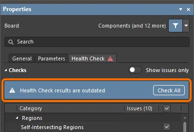 When no object is selected in the active PCB document, the Properties panel includes the Health Check tab that enables you to configure, perform, and explore the results of the PCB Health Check.