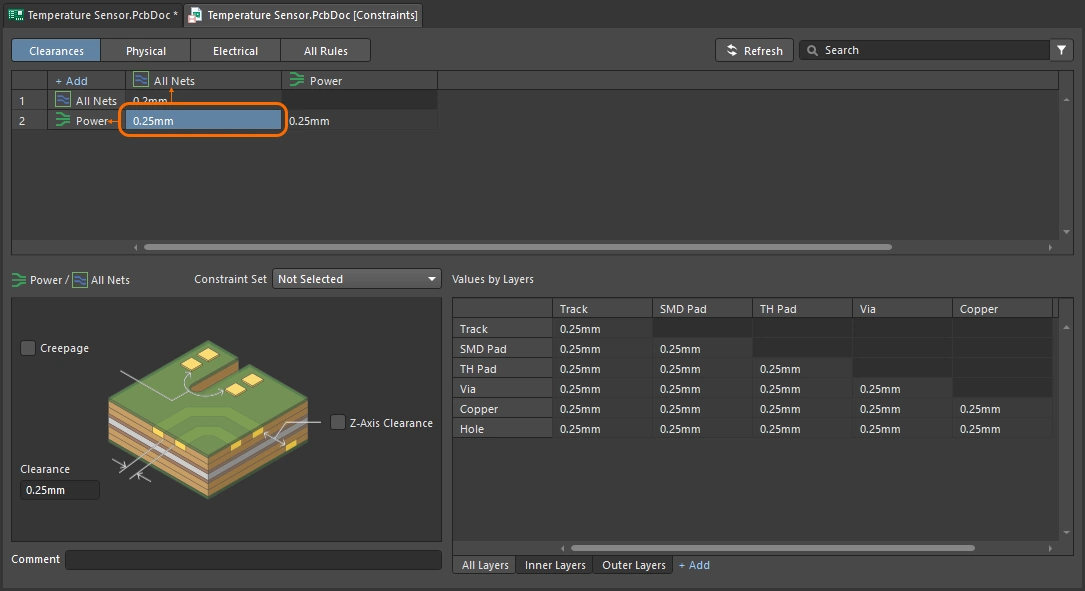 Working with the width constraint is the clearance constraint, it defines how close the net you are routing is allowed to get to other objects on the board. Again, you can define multiple clearance constraints, to keep higher voltage nets or differential pair nets away from other routing, or to keep polygon pours a specific distance from routing, and so on.