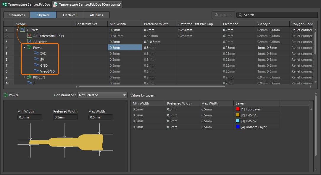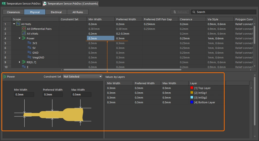 The Width constraint defines the minimum, preferred and maximum widths of the track segments that make up the routing. The settings can be defined as physical widths, or require the net(s) to be routed using a specified impedance profile. A handy feature is the ability to change the routing width between the minimum and maximum settings as you route, or have the route automatically narrow to fit through a tight location. You can read more about these features in the Interactive Routing page.