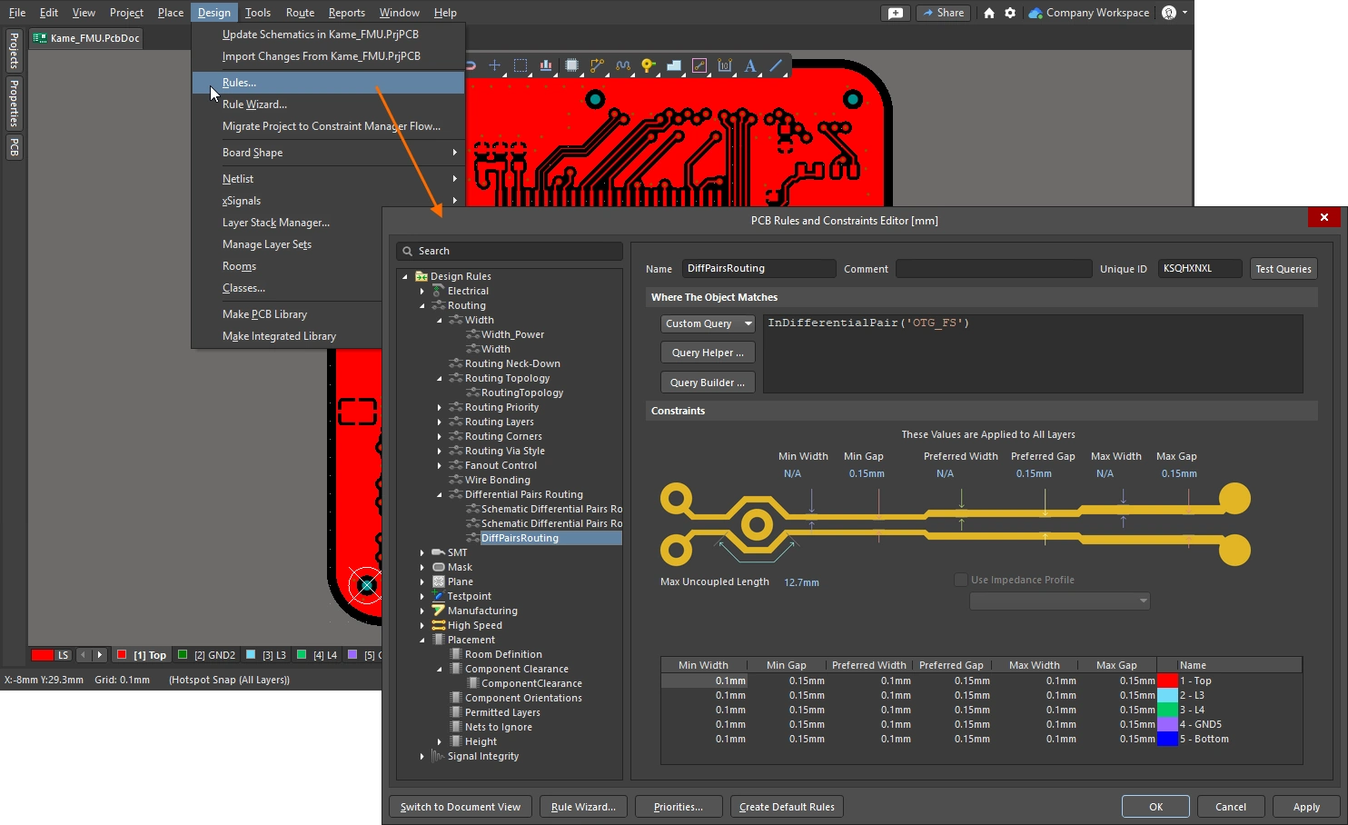 To check which design constraints approach is used in your current PCB project, see if the Design » Constraint Manager command is available in the main menus of the Schematic editor or PCB editor when a schematic or PCB document is open. If the command is there, then the Constraint Manager is used for this project. Otherwise, if you see the Design » Rules command in the PCB editor, then the PCB Rule and Constraints Editor dialog is used for this project. You choose which approach is used when the project is first created. Learn more about the Constraint Manager.