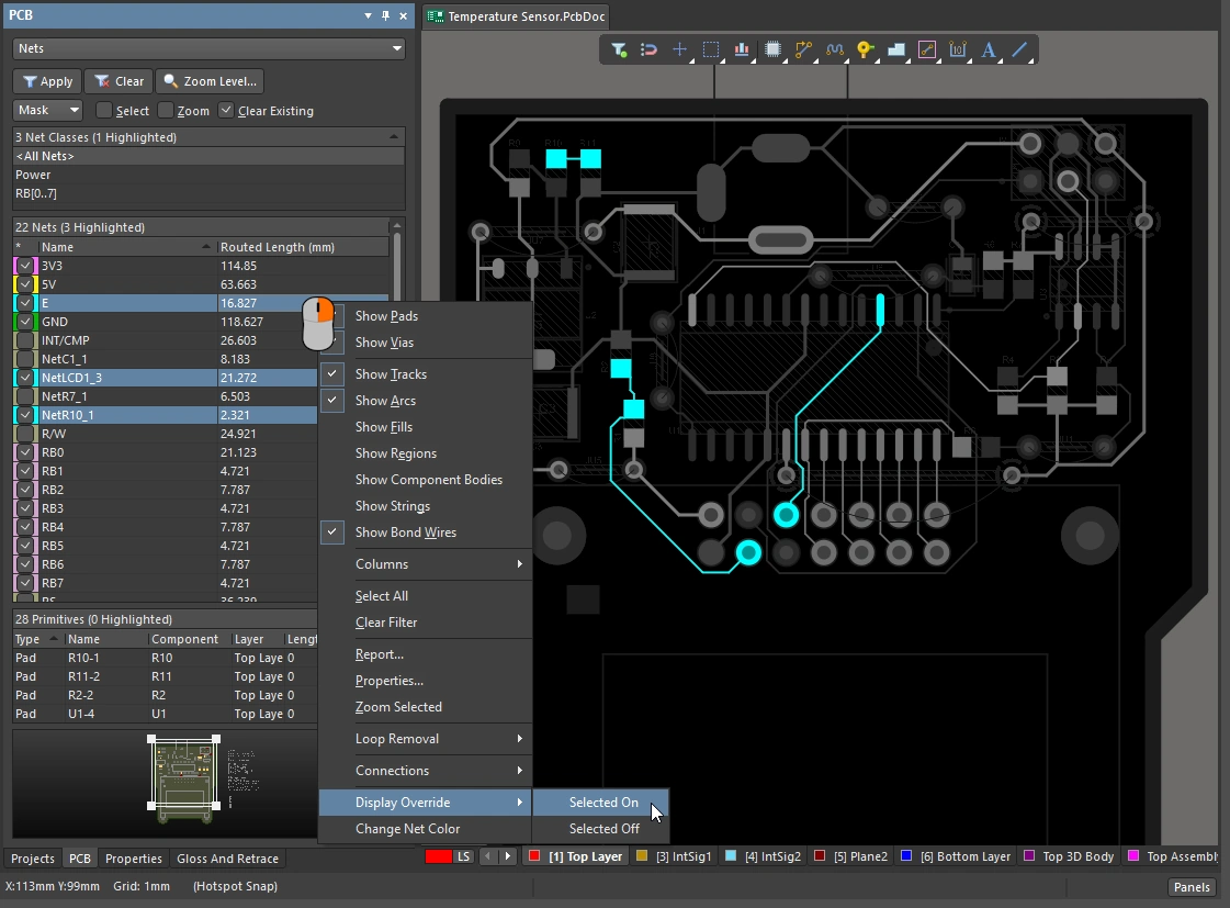 In the PCB editor, the net color override feature can be controlled at the individual net level, allowing you to switch it on for just the nets you are interested in right now ( ). |