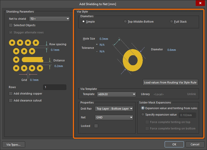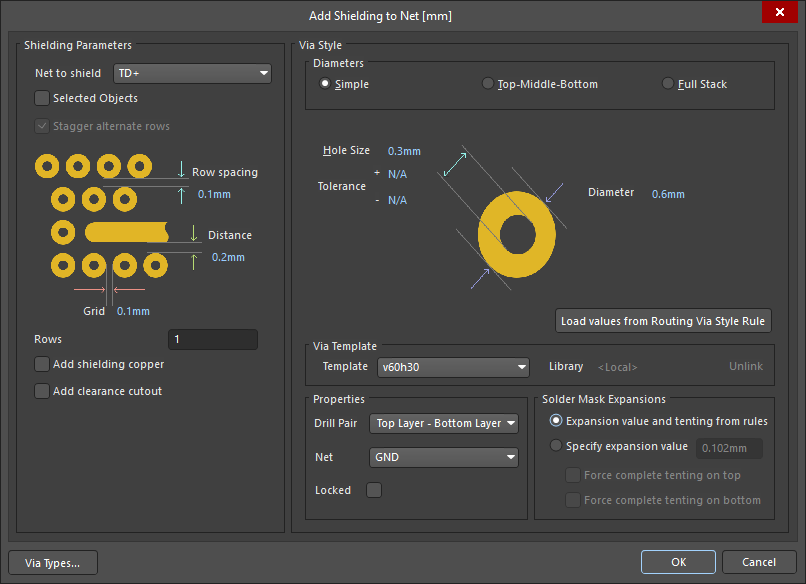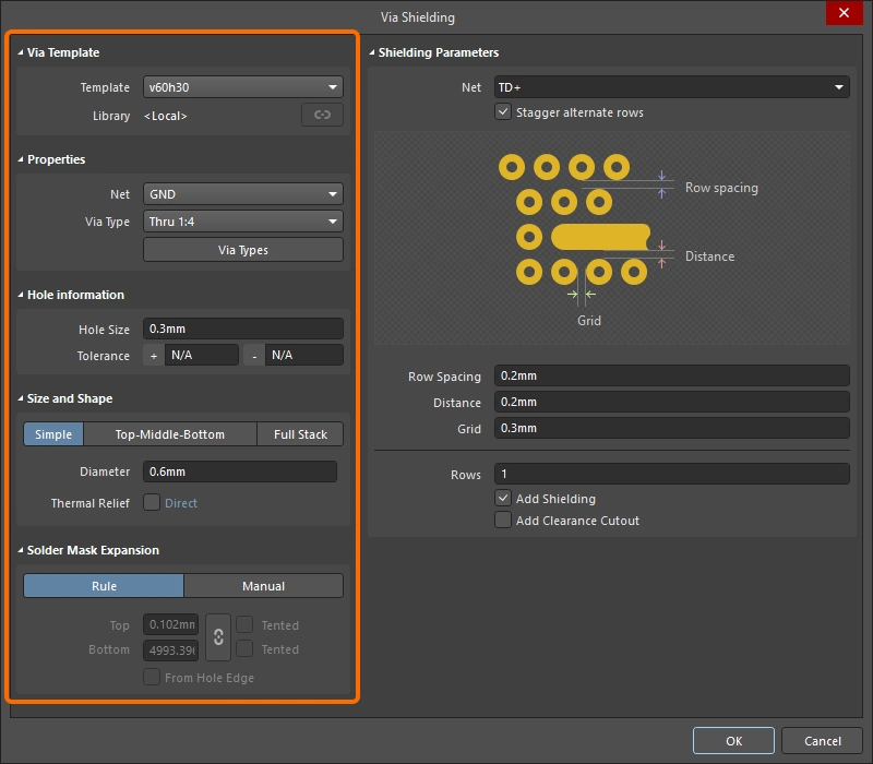 New shielding via sets are configured in the Add Shielding to Net dialog, existing via sets are then edited in the Via Shielding dialog (), or the Properties panel ().  The fields for all three of these are described below.