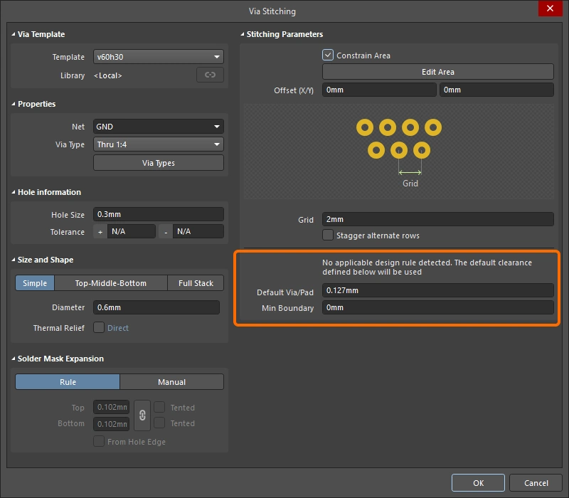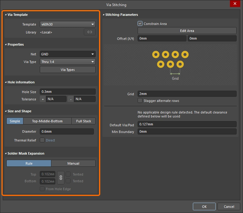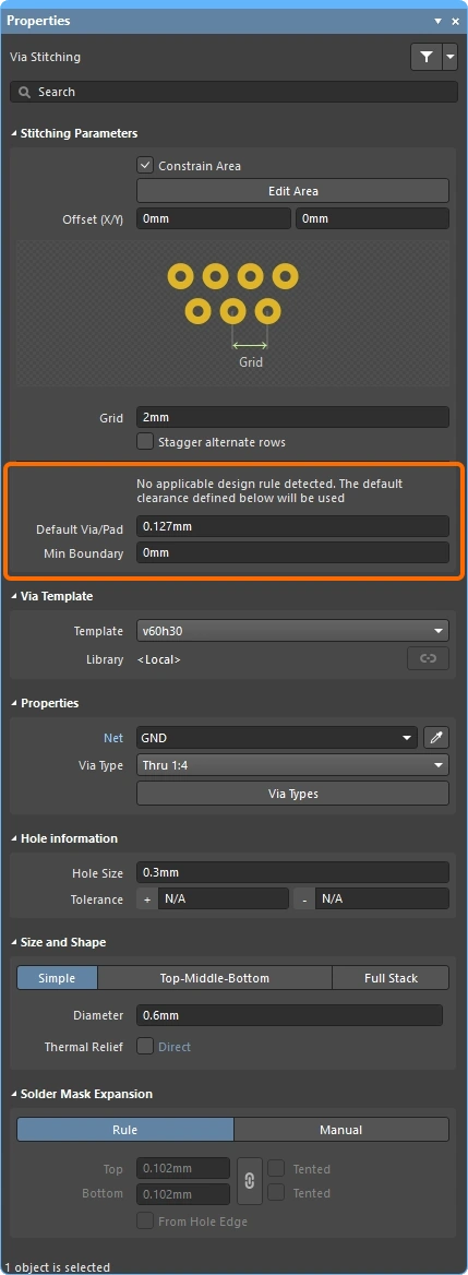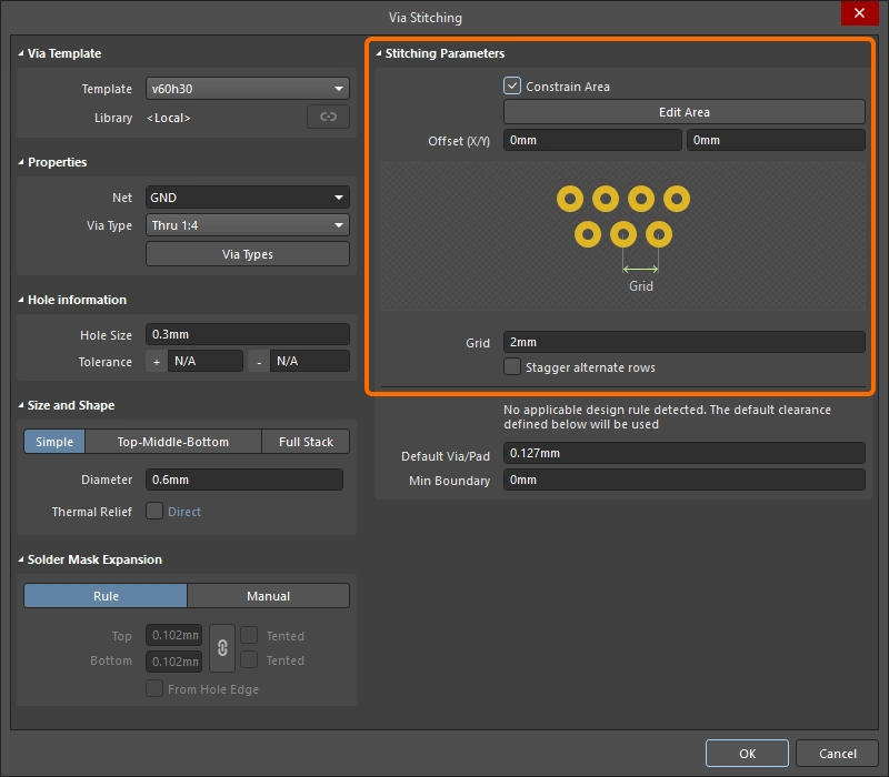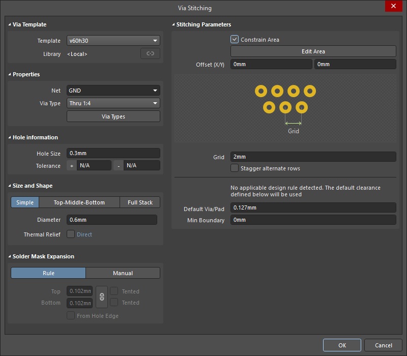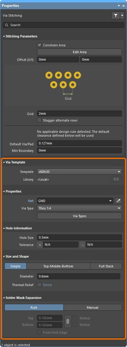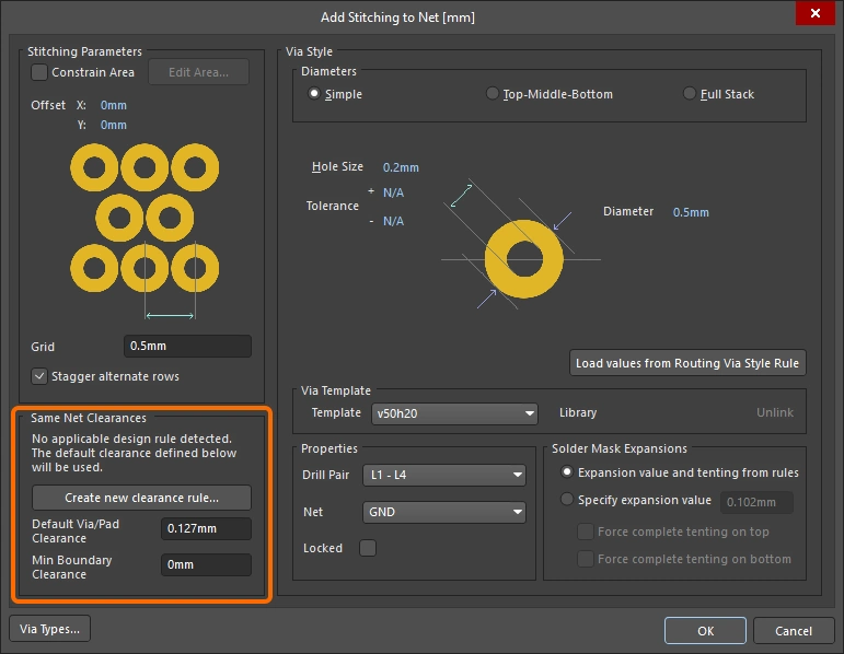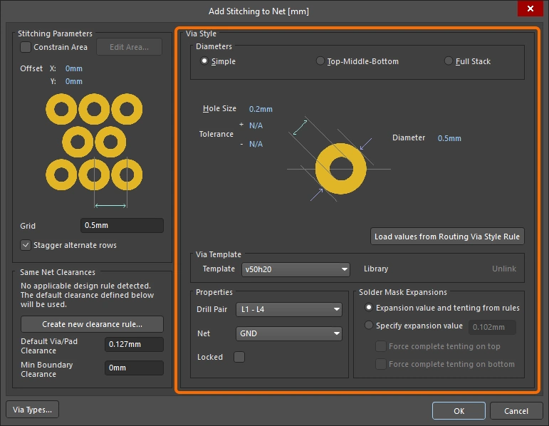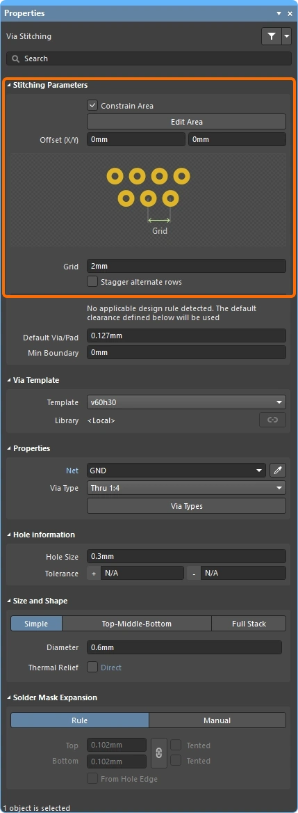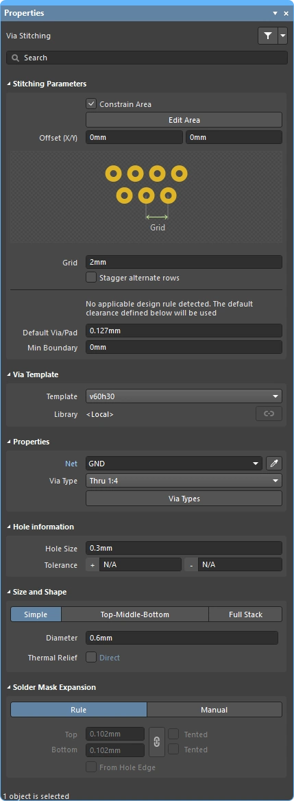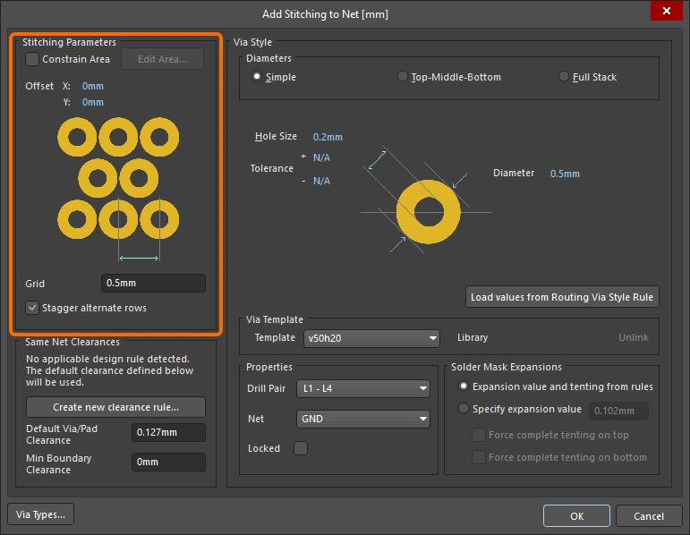 New stitching via sets are configured in the Add Stitching to Net dialog, existing via sets are then edited in the Via Stitching dialog (), or the Properties panel (). The fields for all three of these are described below.