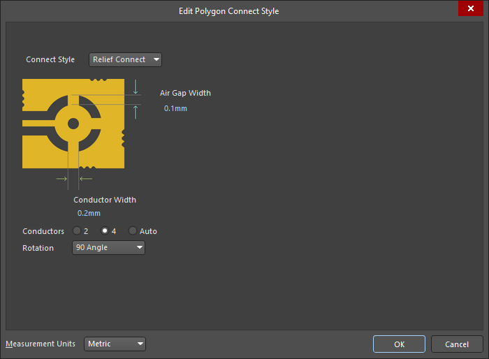 • Once stitching is complete, you will need to re-pour all impacted polygons that have an applicable Polygon Connect Style design rule specifying a relief connection style.
