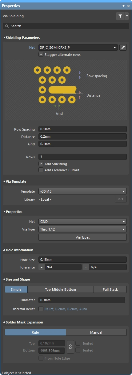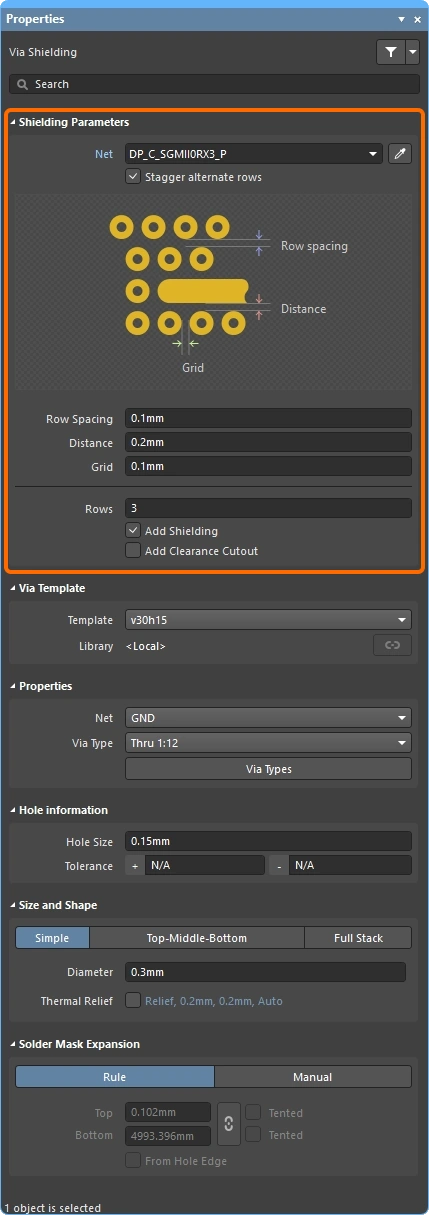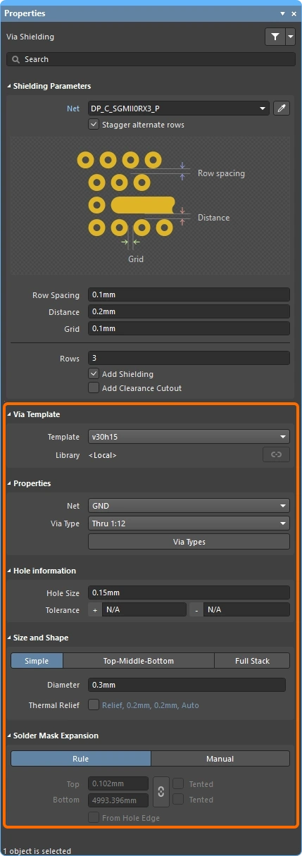 The properties of a stitching or shielding via set can be edited once it has been selected, in the Via Stitching or the Via Shielding mode of the Properties panel. Double-click on any via in the set to open the panel.