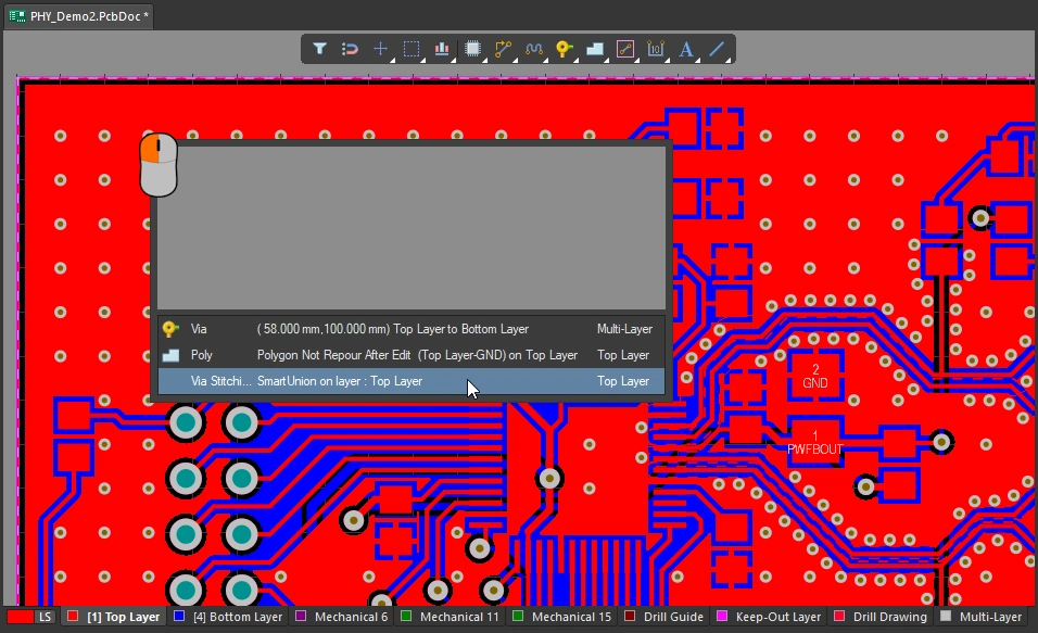 • If the Popup Selection Dialog option is enabled in the Preferences (), clicking on an individual via that belongs to a union will display a list that includes the union, as shown in the image above. When a union is selected, that union of vias can be deleted in the workspace, or edited in the Properties panel.
