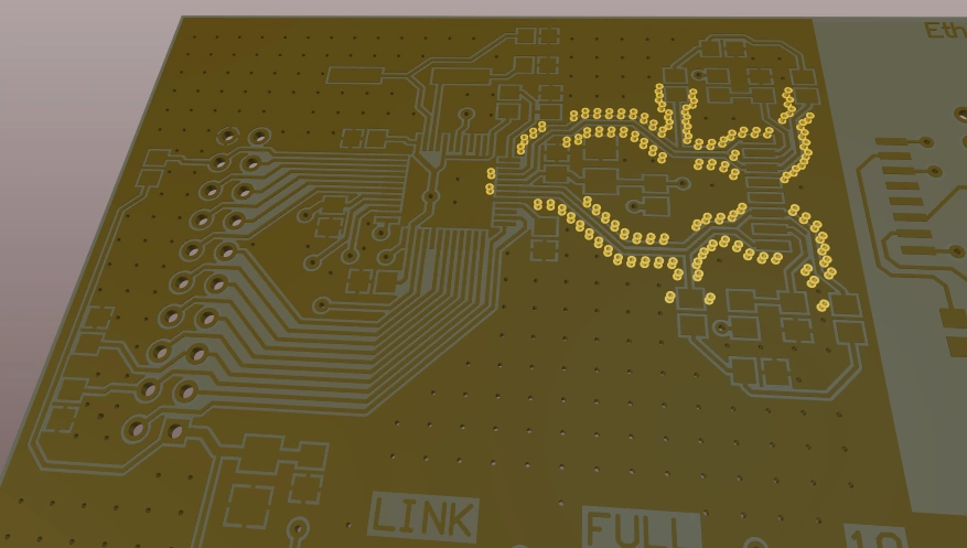 The Add shielding copper option will add a polygon that encloses the shielding vias. The polygon edge that is away from the shielded net will touch the edge of the vias. The polygon edge that is adjacent to the shielded net will be set back from the net by the applicable Clearance design rule. If the Add clearance cutout option is also enabled, the polygon will instead be set back from the shielded net by the Distance setting in the Add Shielding to Net dialog. Hover the cursor over the image below to see the difference.