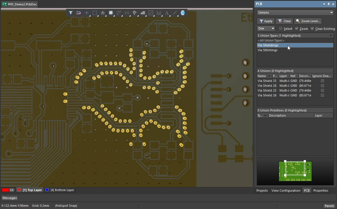 To simplify the process of working with an array of stitching/shielding  vias, both kinds are automatically clustered into a union. Unions are managed through the PCB panel.