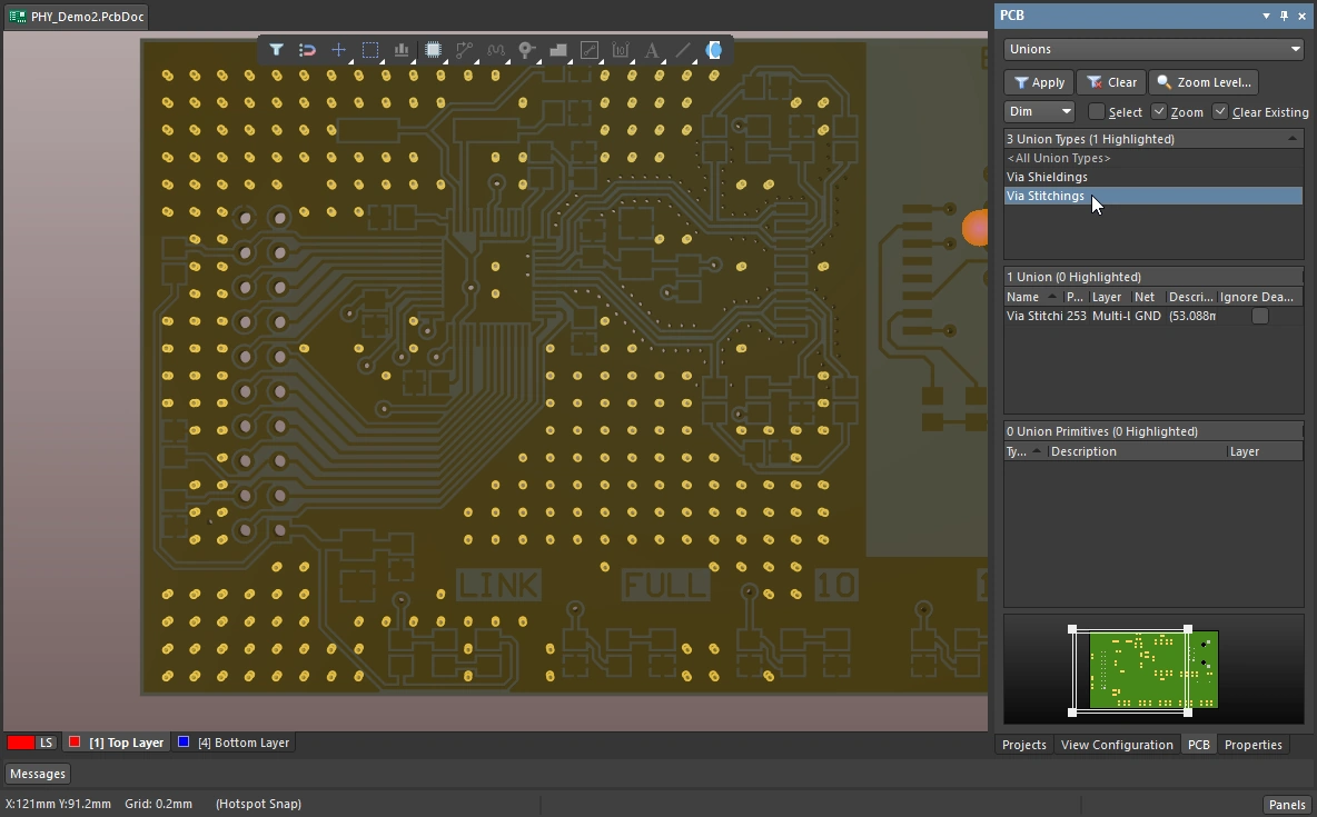 • Each set of stitching vias are added to a union, set the PCB panel to Unions mode to explore these unions ().