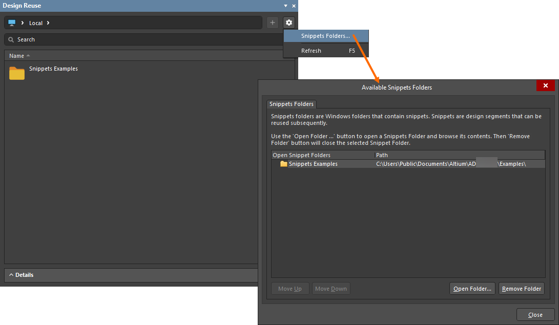 Local snippets can be organized into snippet folders, so that related snippets can be grouped together, making it easier for you to find them. Snippets folders are existing Windows folders that cannot be created from within the Design Reuse panel. Instead, they are 'opened' or 'closed' when browsing the local snippets they contain. These folders can only be created directly on your hard drive or network outside of Altium Designer.