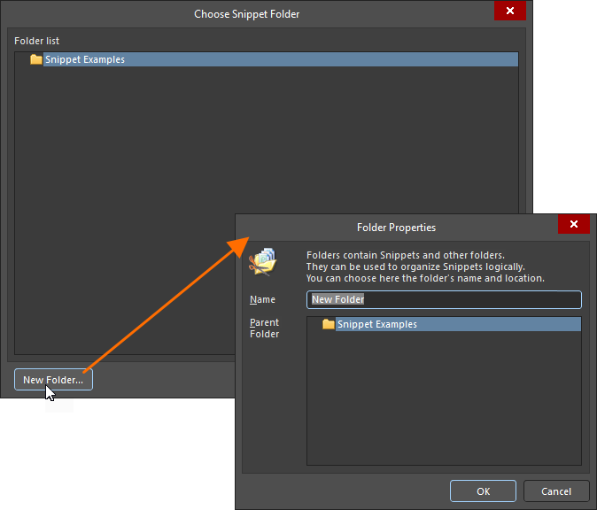 • In the Choose Snippet Folder dialog, click the  button and use the Folder Properties dialog that opens to add a new subfolder to the overall local snippet folder structure (). In the dialog, you can specify a name for the new folder and determine under which parent folder it is to be created.