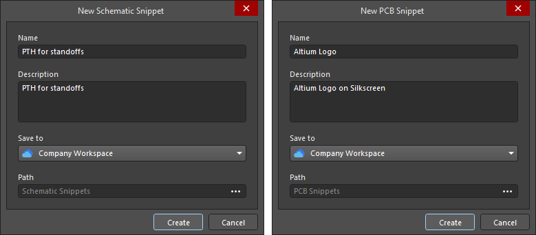 3. The New Schematic Snippet or New PCB Snippet dialog will appear, in which you can define the Name, Description, saving destination (Save to – the connected Workspace or a local folder), and the folder into which the new snippet will be saved (Path).