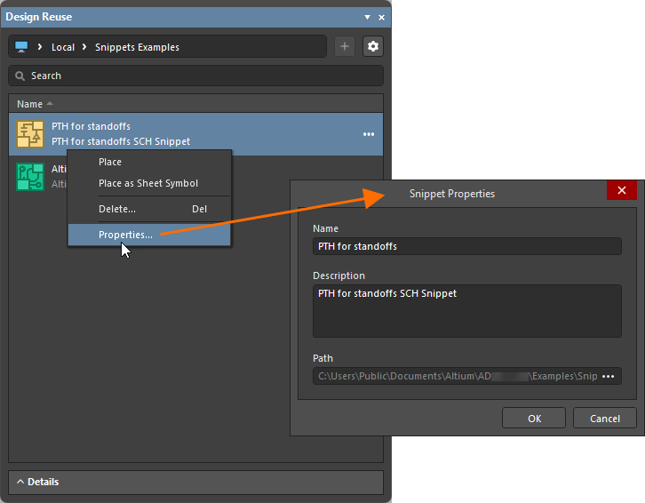 The properties of a local snippet (its name, description, and path) can be edited using the Snippet Properties dialog. To access this dialog, hover the cursor over its entry in the Design Reuse panel and click the  button (or right-click the entry) and select the Edit command from the context menu. Use the dialog to make the required changes.