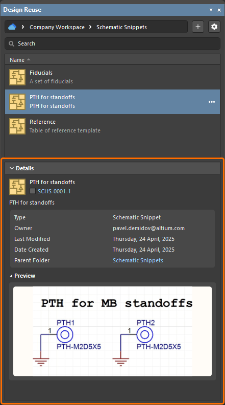 • History (for a Workspace snippet only) – use to access a detailed view for the snippet, opened as a new tabbed view within Altium Designer.