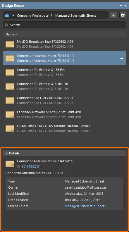Managed schematic sheets stored in your connected Workspace can be browsed and used from the Design Reuse panel when it is set to display Workspace resources (