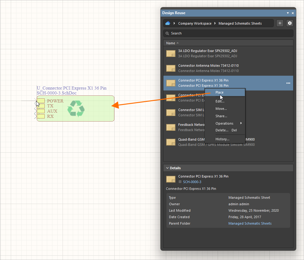 The Design Reuse panel described below is in Open Beta and available when the UI.ModernDesignReusePanel option is enabled in the Advanced Settings dialog. When this option is disabled, a managed schematic sheet can be placed from the Explorer panel. To do this, browse or search for the managed schematic sheet you wish to place, right-click on the specific revision of the managed schematic sheet required (typically the latest, in which case just right-click directly on the top-level Item entry), and choose the Place command.