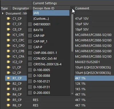 The way in which component data is presented in the Item Manager dialog is highly configurable, based on the data columns that are enabled and/or grouped. This allows the list of design content and their associated system/user parameters to be shown in a way that matches specific approaches to component identification – all item parameters, such as proprietary company part numbers, for example, can be displayed as needed.