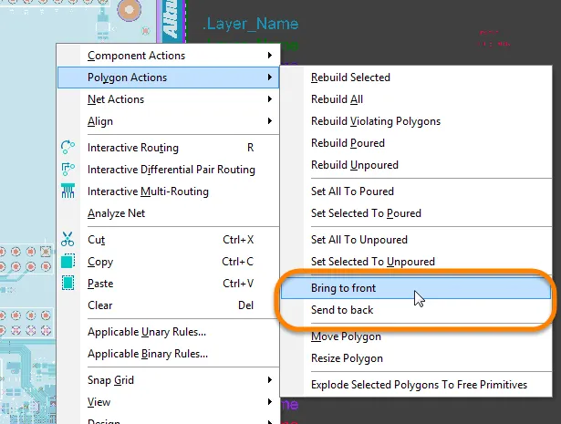 Polygon rankings were previously lost when importing Eagle files to CircuitStudio. With the CircuitStudio 1.4 update, Bring to Front and Send to Back commands have been added for additional control over the priority of polygons, to ensure that overlapping polygons are filled properly.