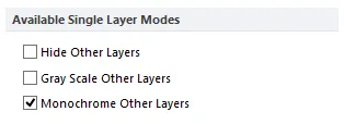 Single layer mode toggle options have been added to the PCB Editor - Display page of the Preferences dialog. Designers can use the Shift+S keys to cycle between available modes.