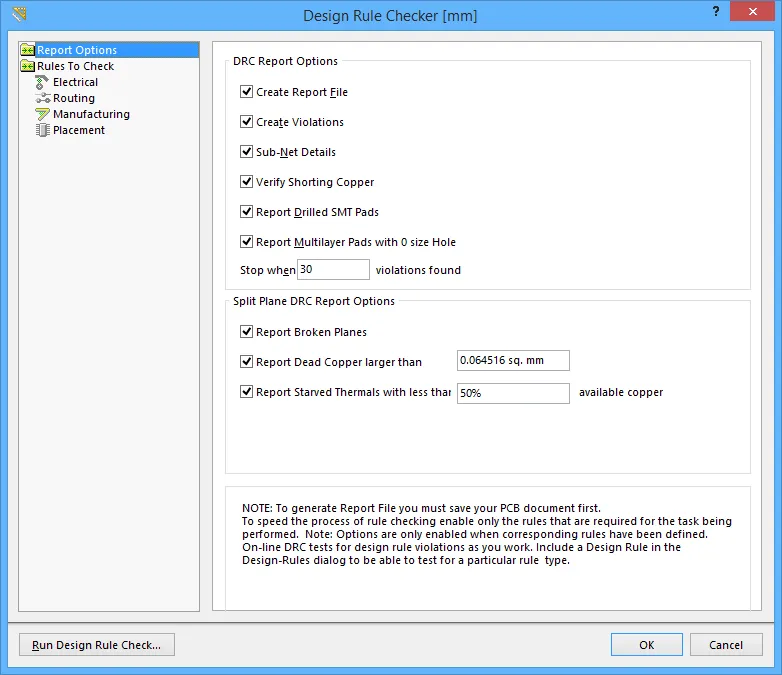 This dialog allows you to configure design rule checking for the board. Design Rule Checking (DRC) is a powerful automated feature that checks both the logical and physical integrity of a design. Checks are made against any or all enabled design rules and can be made online, during design, or as a batch process (with an optional report). This feature should be used on every routed board to confirm that minimum clearance rules have been maintained and that there are no other design violations. It is particularly recommended that a batch mode design rule check always be performed prior to generating final artwork.