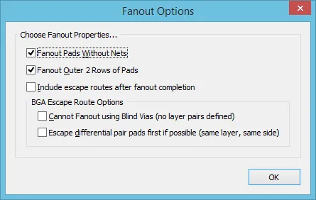 • Fanout Outer 2 Rows of Pads - enable this option to fanout pads from the component, including the outer two rows (which are usually easily routed).