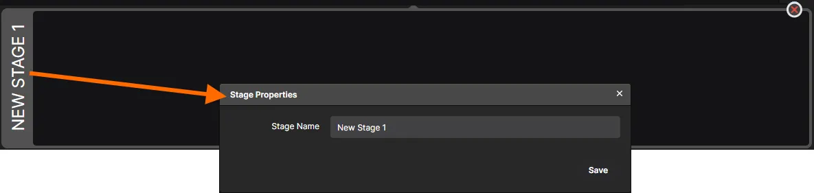 button to add a new stage graphical entity. This will be added below the DESIGN stage. Initially, the stage will be named NEW STAGE 1. Change this as required in the Stage Properties window, accessed by double-clicking on the stage graphic.