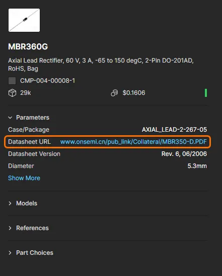 menu at the far right of the component entry. The linked datasheet will open in a new browser tab. You can otherwise open such a link from the component's right-hand information pane.