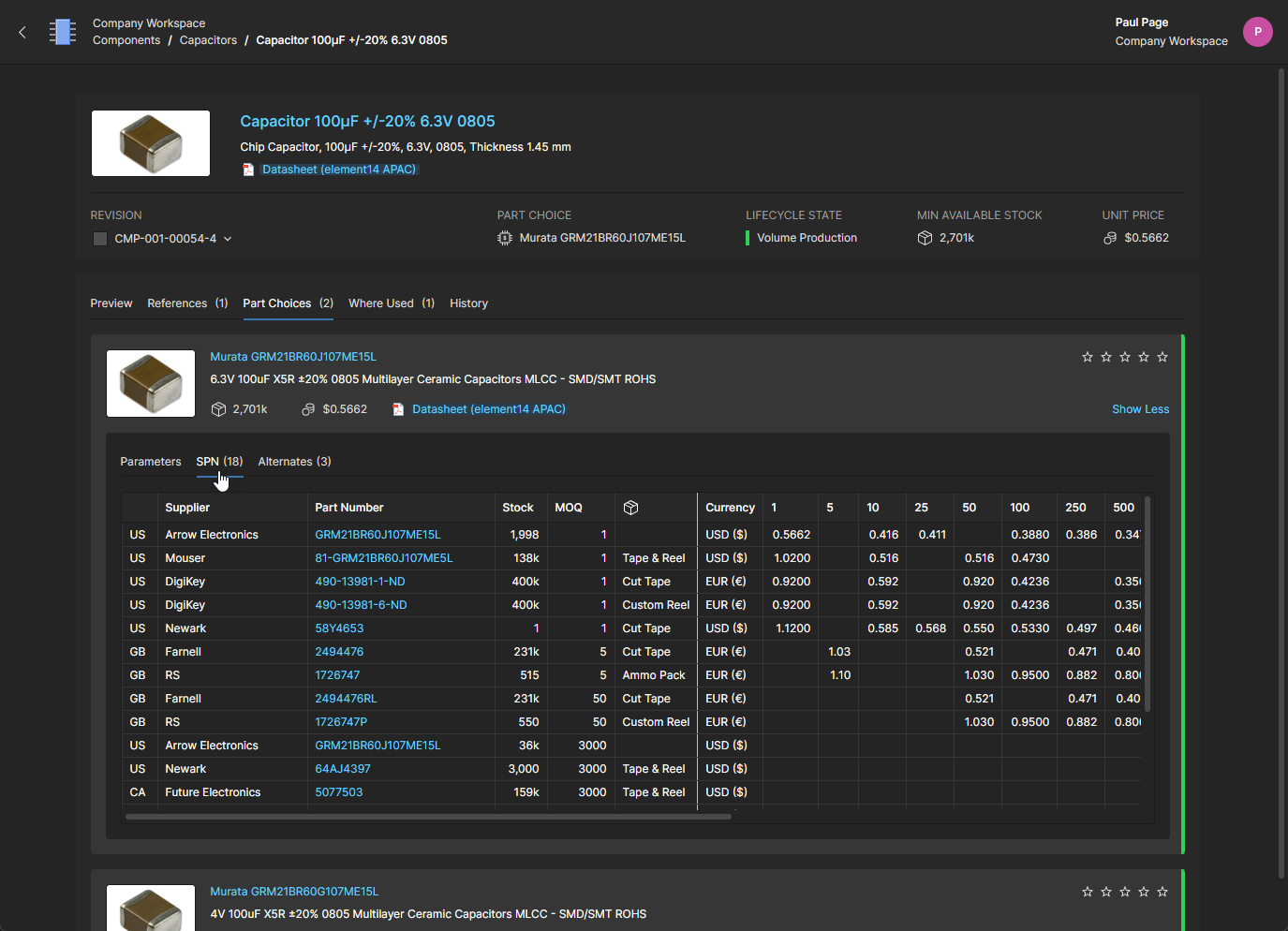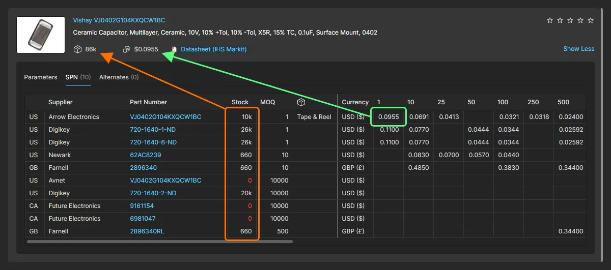 The component supply chain data is sourced from Octopart, however for some organizations, component supplier data is (and must be) sourced from an internal company enterprise system that provides a proprietary set of parts supplier data. This might be based on a tightly approved range of vendors and/or special pricing structures.