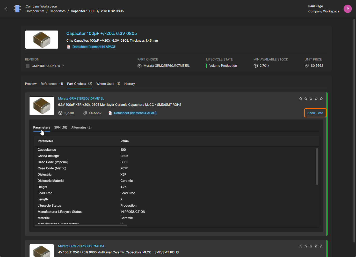 Detailed Part Choice data – select the Show More option within a Part Choice tile entry to view the component's parameters and details of the supplier options for that manufacturer part.