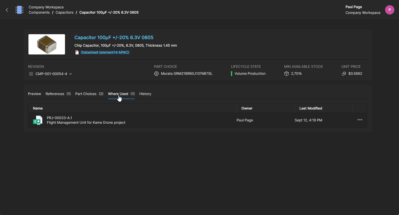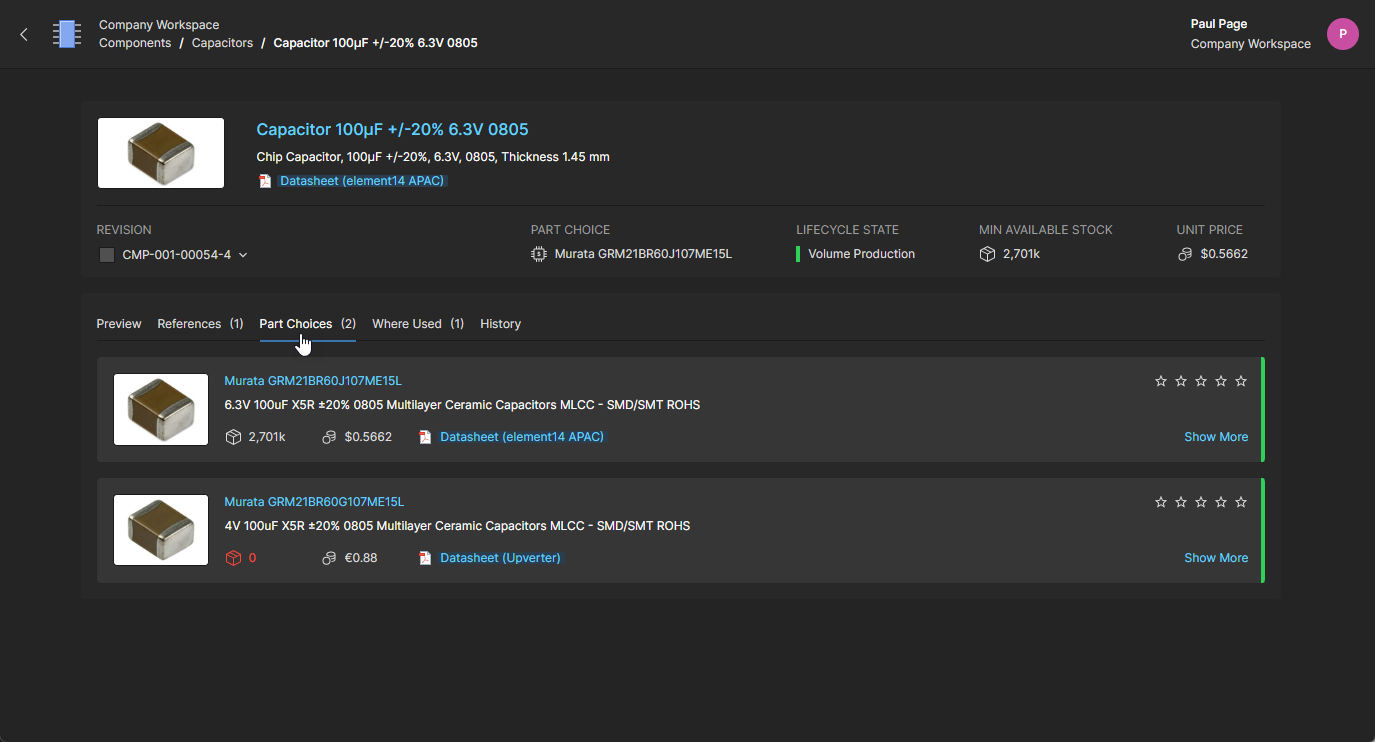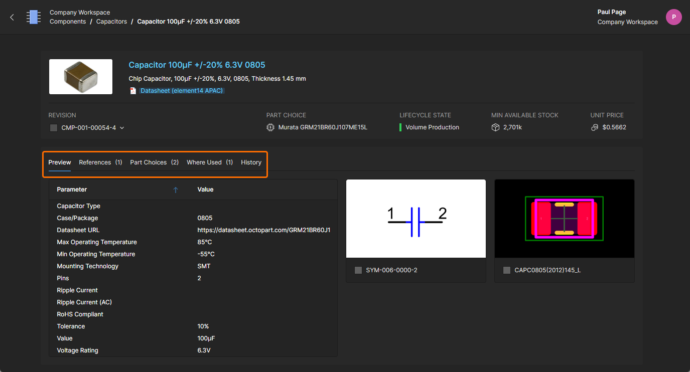 The Component view, which opens in a new browser tab, is formatted to include related information under selectable tabs (Part Choices, Where Used, etc.) and also allows a particular component revision to be selected for viewing (Revision drop-down menu). Links included in the tab views are active and will open the target reference (manufacturer/supplier data sheets, where-used entities, etc.) in a new browser tab.