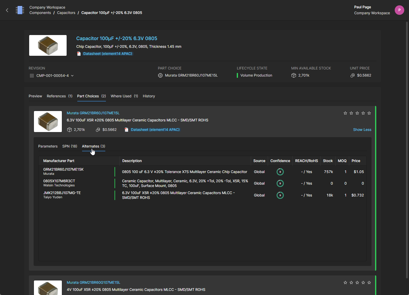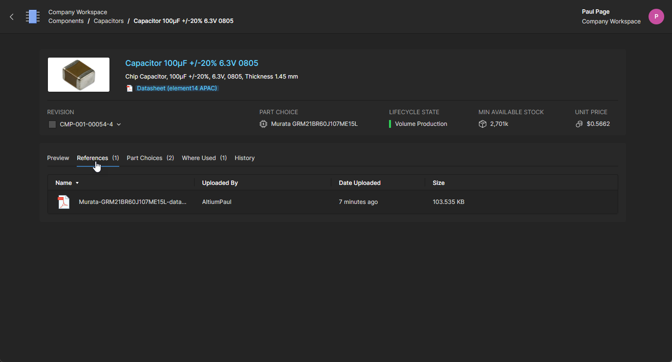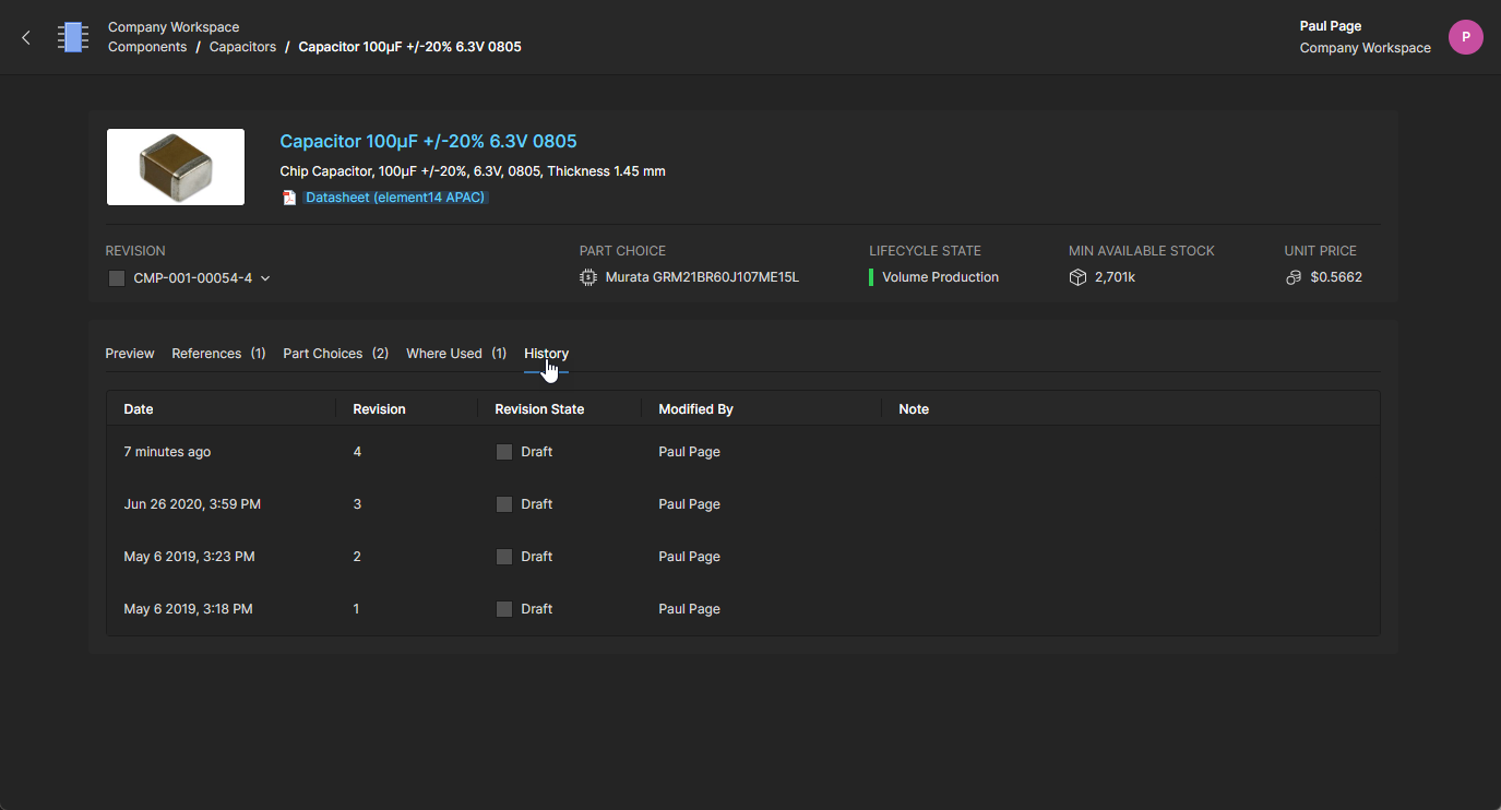 The Component view, which opens in a new browser tab, is formatted to include related information under selectable tabs (Part Choices, Where Used, etc.) and also allows a particular component revision to be selected for viewing (Revision drop-down menu). Links included in the tab views are active and will open the target reference (manufacturer/supplier data sheets, where-used entities, etc.) in a new browser tab.