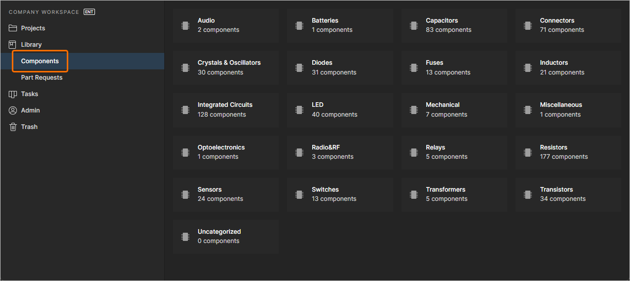 When first accessed, the Components page presents a summary of the components in the Workspace, by type. Clicking on a tile will present a flat listing of all components of that type. This listing can also be accessed by choosing a component type from the drop-down at the top-left of the page. The type of component category a particular component is listed under is determined by its Component Type parameter. This parameter is specified when creating or editing a component, or when components are imported into the Workspace. See Building & Maintaining Your Components and Libraries for more information.