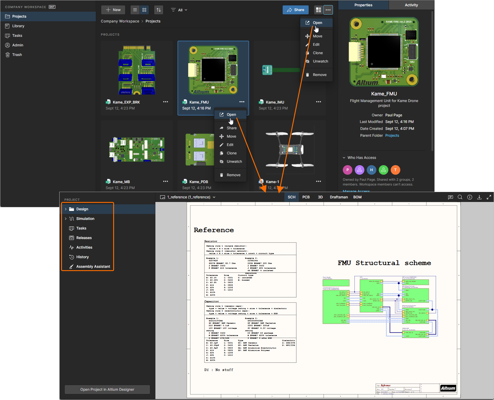 The Workspace provides an advanced, manufacturing-oriented CAD-centric view of the project, opened by selecting the required project, clicking the control above the listing of projects, and choosing the Open entry on the associated menu. Alternatively, double-click directly on the required project entry in the list.