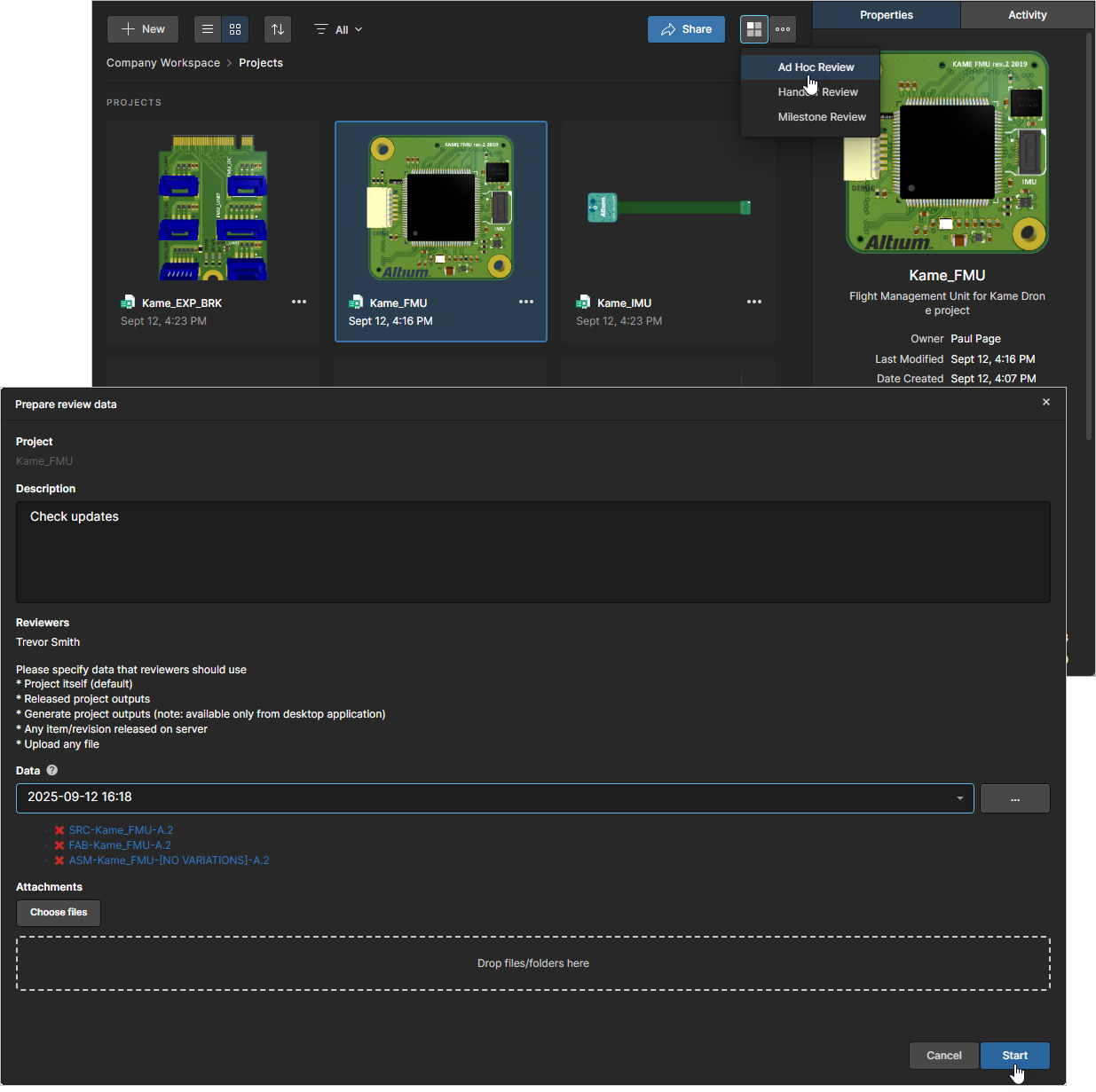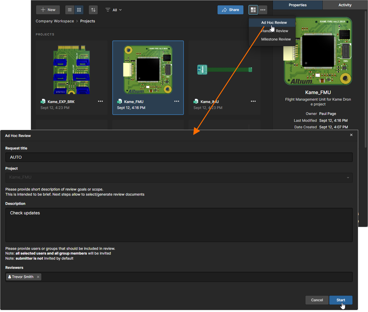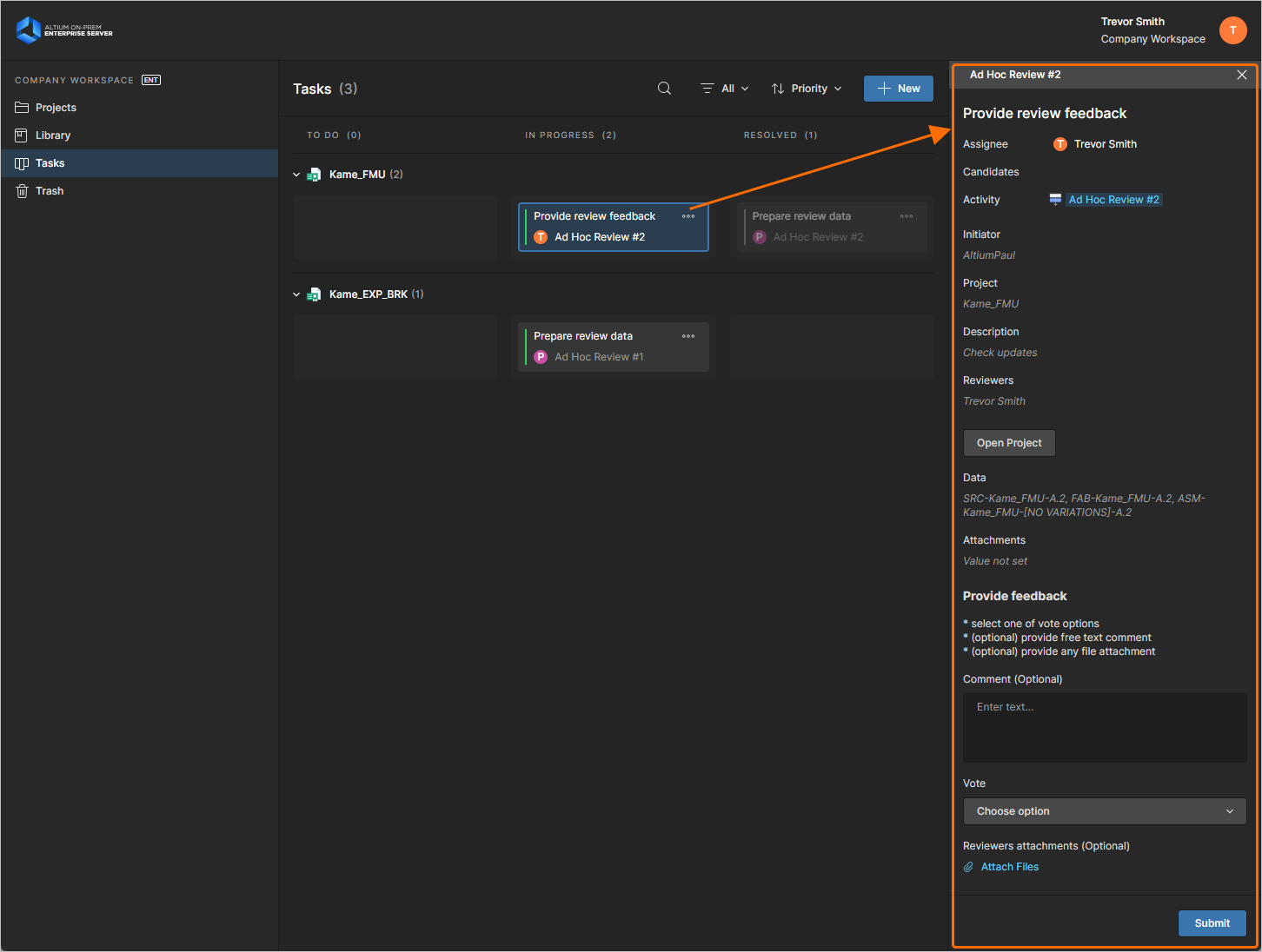 The Workspace offers the unique capability of applying configurable Process Workflows to Workspace projects in order to perform tailored tasks such as performing design reviews and creating new projects. Processes and their underlying Workflows are created and configured by a Workspace administrator, and when enabled, become available to users of both Altium Designer and the Workspace browser interface.
