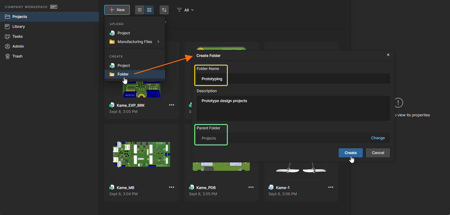 Continue creating further folders as required, effectively building a hierarchy of folders in which to store and categorize your design projects. Those folders will then be available to choose from as the parent folder when creating a subsequent folder, as illustrated in the following image.