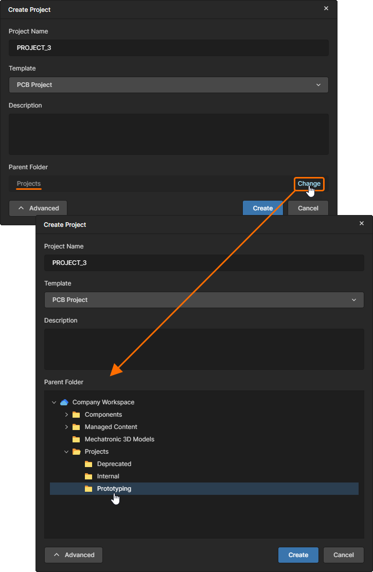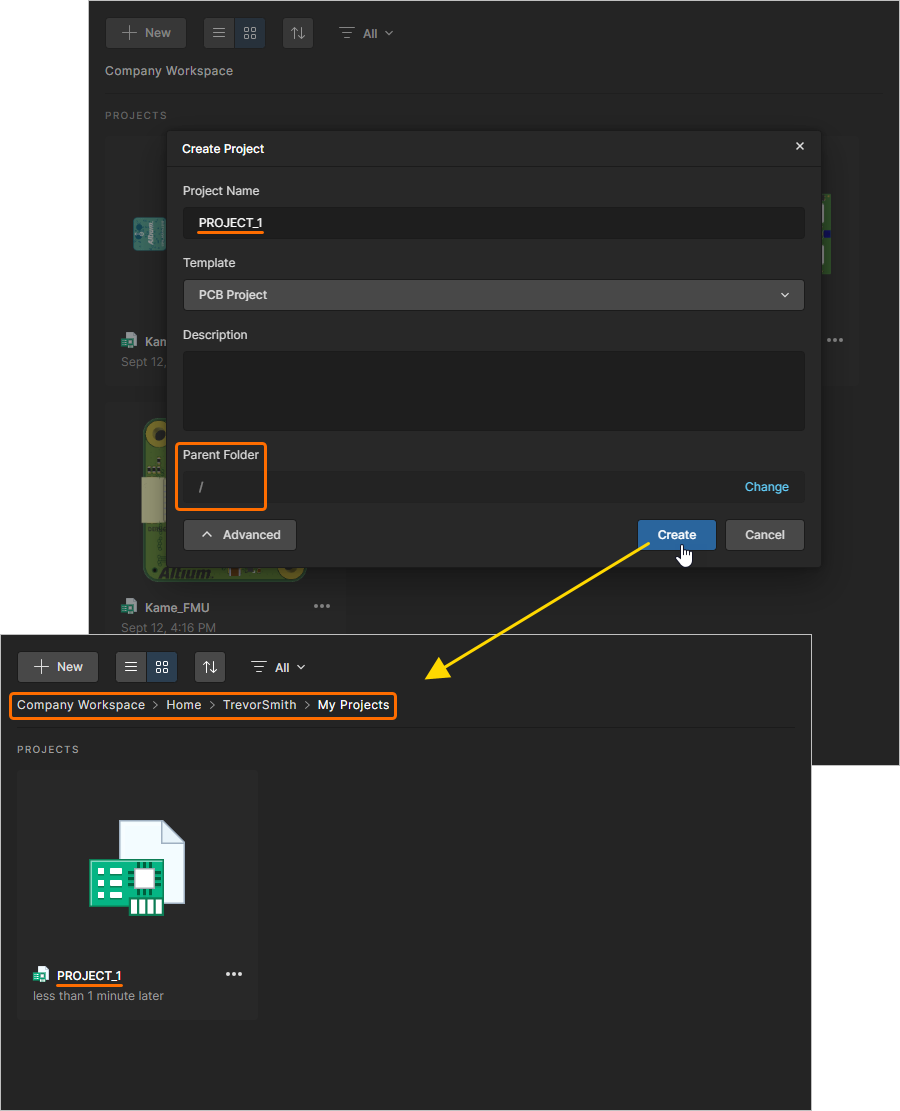 1. You create a new project (via the Create Project dialog in Altium Designer, from the Workspace browser interface, or by making an existing local project available in the Workspace (from within Altium Designer)). During creation, you define the project's name and description.