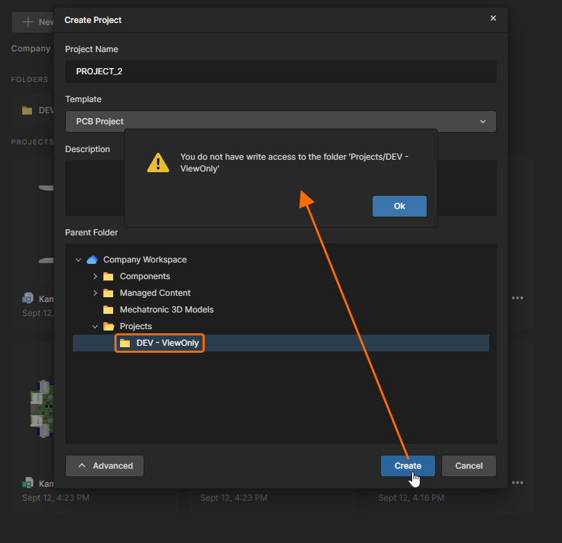 • The Parent Folder target setting is other than the default, but you have only view access to this folder (it is not writable). In this case, the project creation is blocked, and the My Projects folder is not added to ().