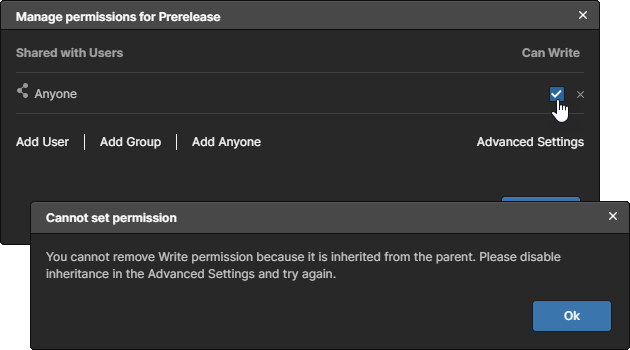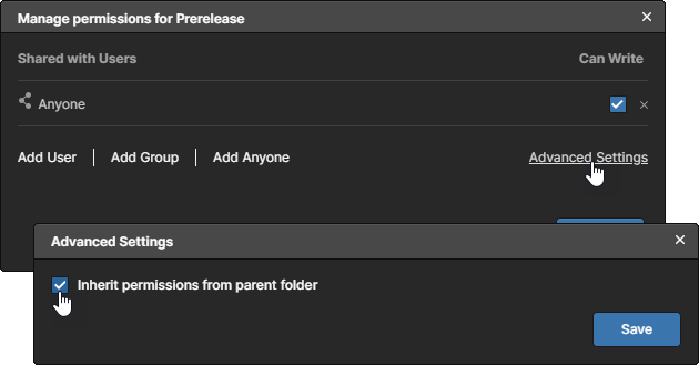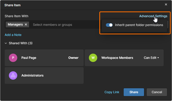 Note that Workspace's permission inheritance scheme may disable some permission level options (). This prevents permissions that were inherited from the parent folder from being demoted, which would contravene the existing parent-child inheritance relationship. To intentionally break the parent-child inheritance, disable the Inherit parent folder permissions option in the Share window's Advanced Settings.