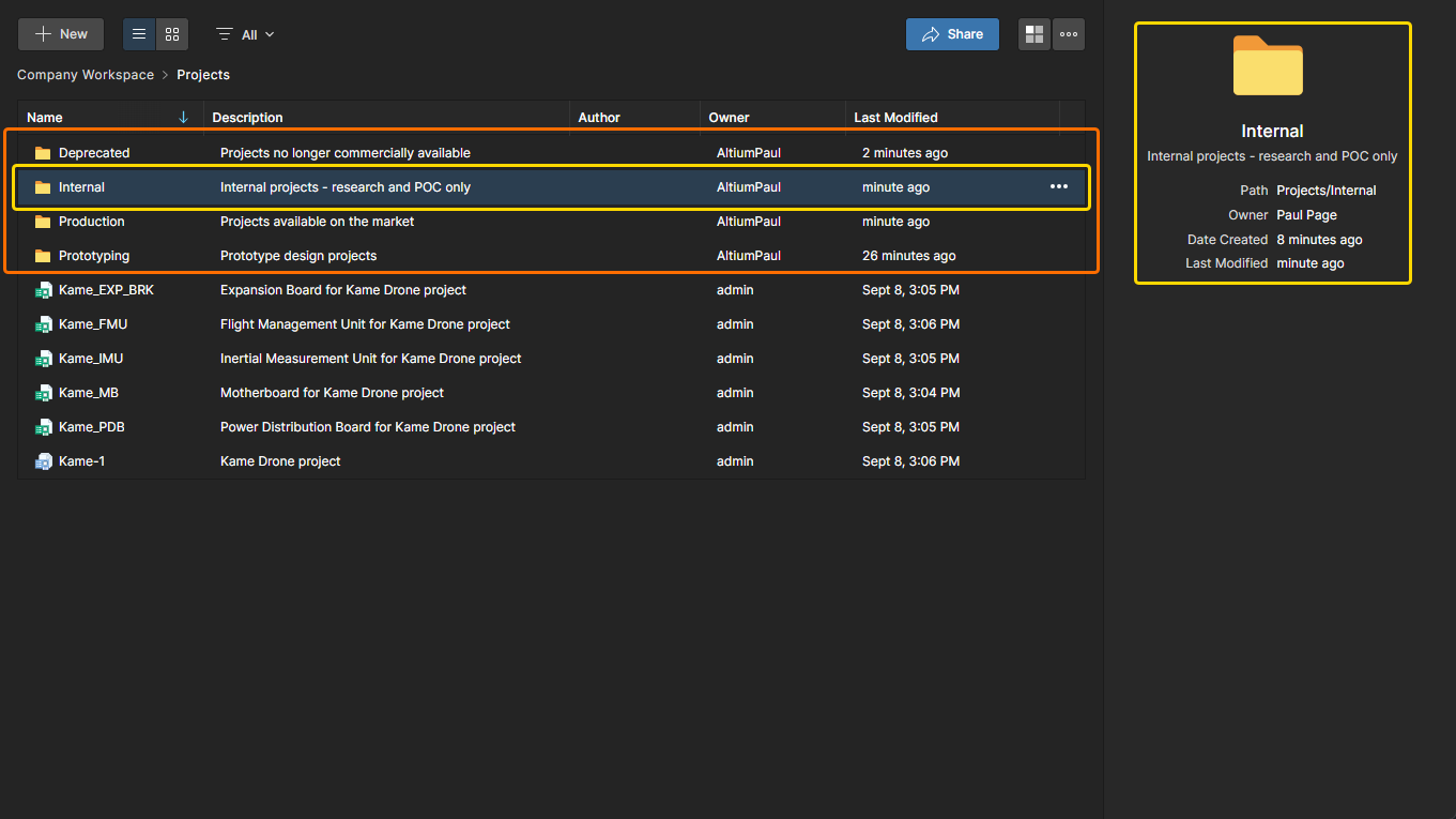 • Workspace Folder ownership can be transferred to another Workspace member through Altium Designer's Transfer Ownership dialog – see Controlling Access to Workspace Content - Transferring Workspace Content Ownership for more information. Folder-level sharing and change of ownership also is available through the Workspace Projects page.