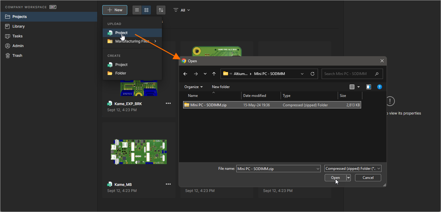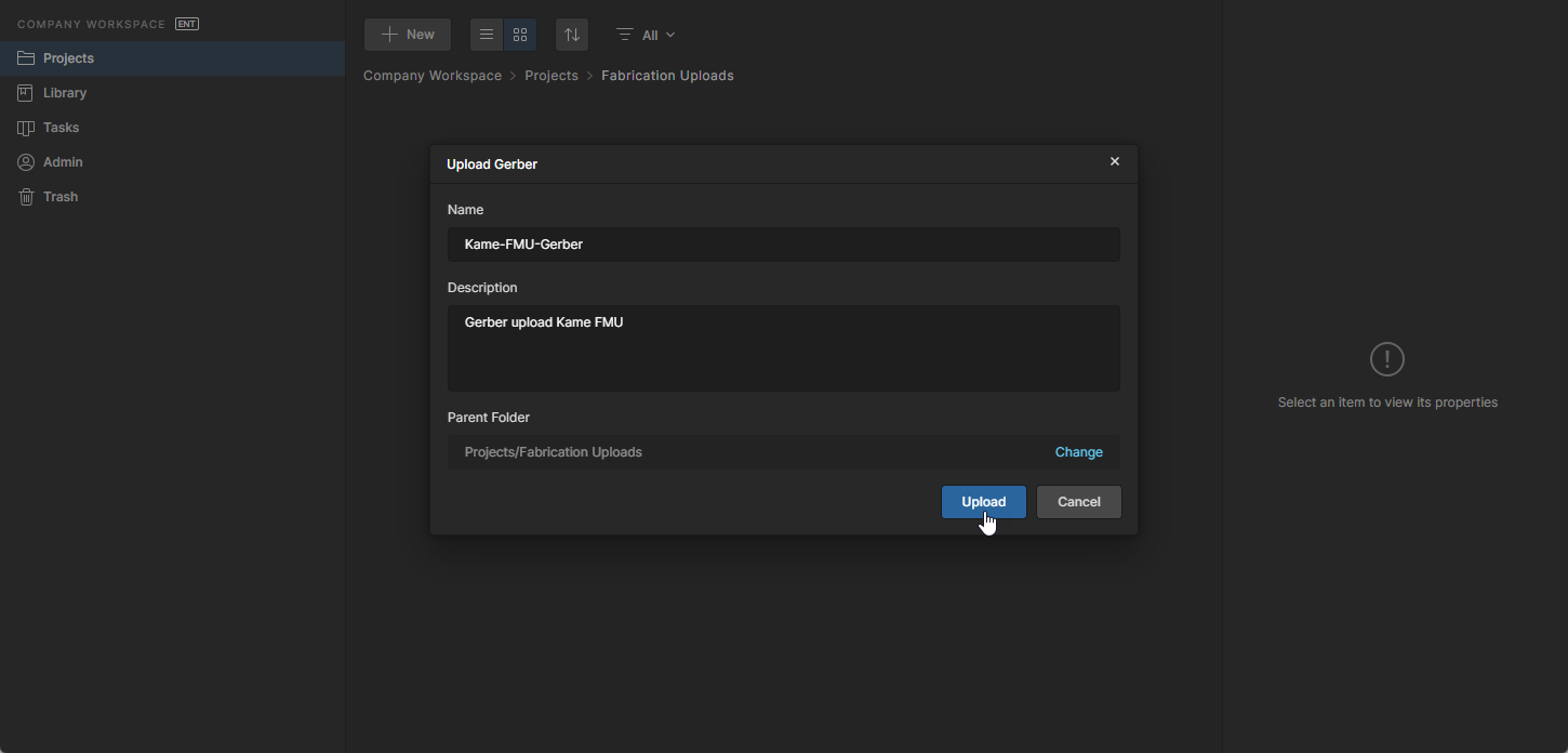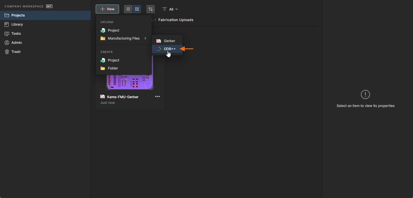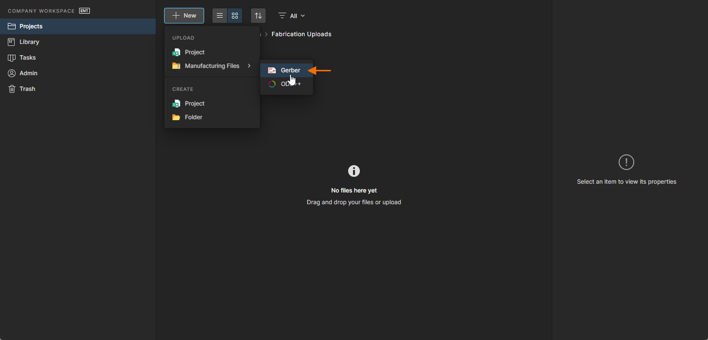 The Workspace also accepts sets of generated Gerber/ODB++ manufacturing files in archive format, which can be uploaded through the Manufacturing Files options available from the button menu. The upload process is essentially the same as the Project upload process outlined above.