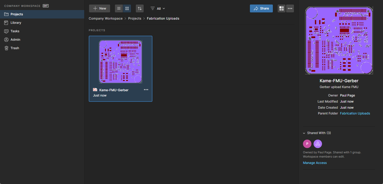 The uploaded fileset will be processed and added to the Workspace project collection with an initial Gerber icon, and then a generated preview image after refreshing or viewing.