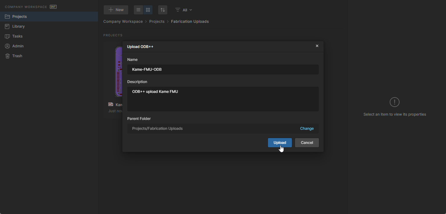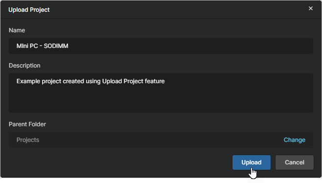 In the Upload ODB++ window, edit the proposed project Name if required (which is taken from the ODB++ archive name) and add a Description. You can use the Change option to specify a project storage location that differs from the default projects storage folder.
