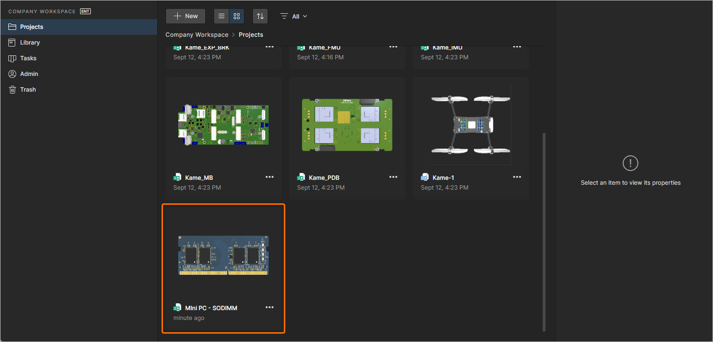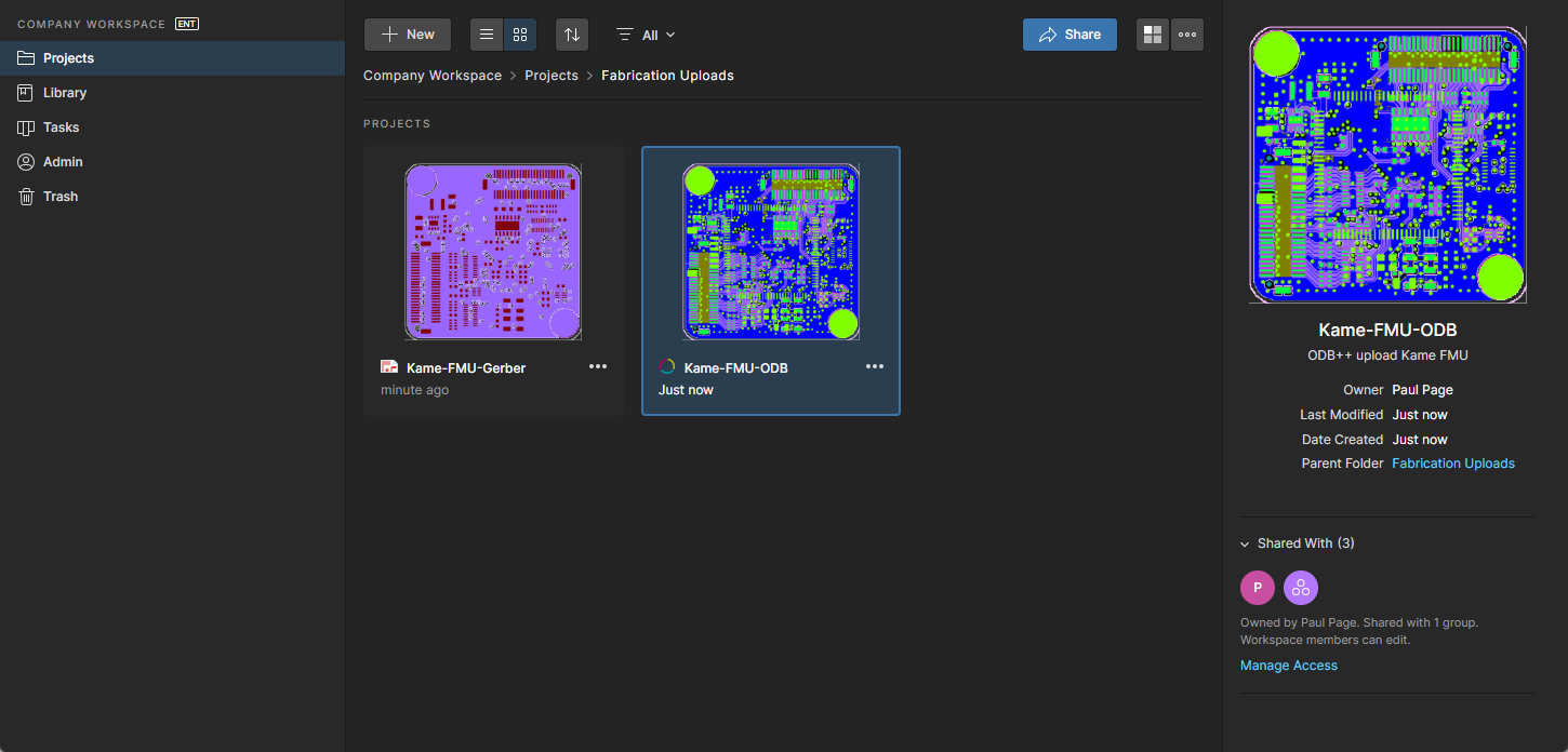 The uploaded fileset will be processed and added to the Workspace project collection with an initial ODB++ icon, and then a generated preview image after refreshing or viewing.