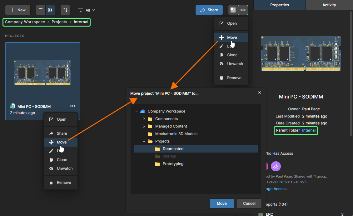 Note that the action of moving a project to a different parent folder will adhere to the Workspace's advanced permission inheritance scheme.